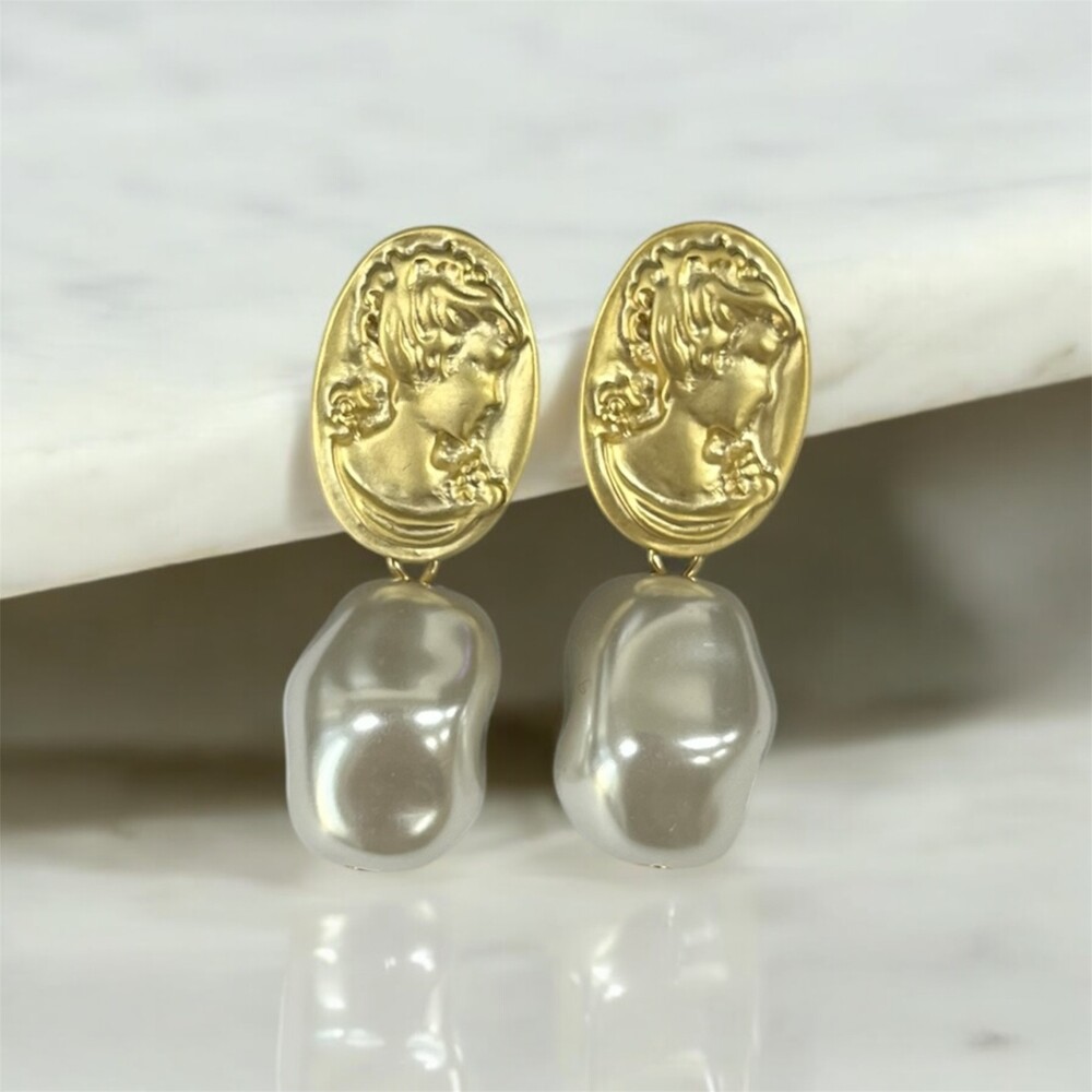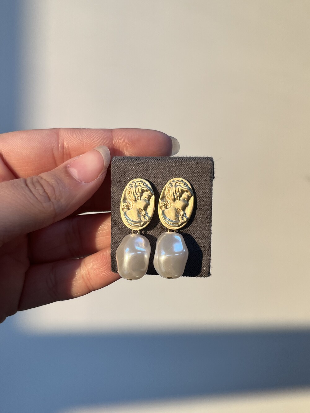 이 귀걸이는 금과 진주를 우아하게 결합하여 고전적이면서도 현대적인 룩을 연출합니다. 섬세한 여성 초상화로 장식된 메달리언은 이 시대를 초월한 보석에 빈티지한 느낌을 더해줍니다.