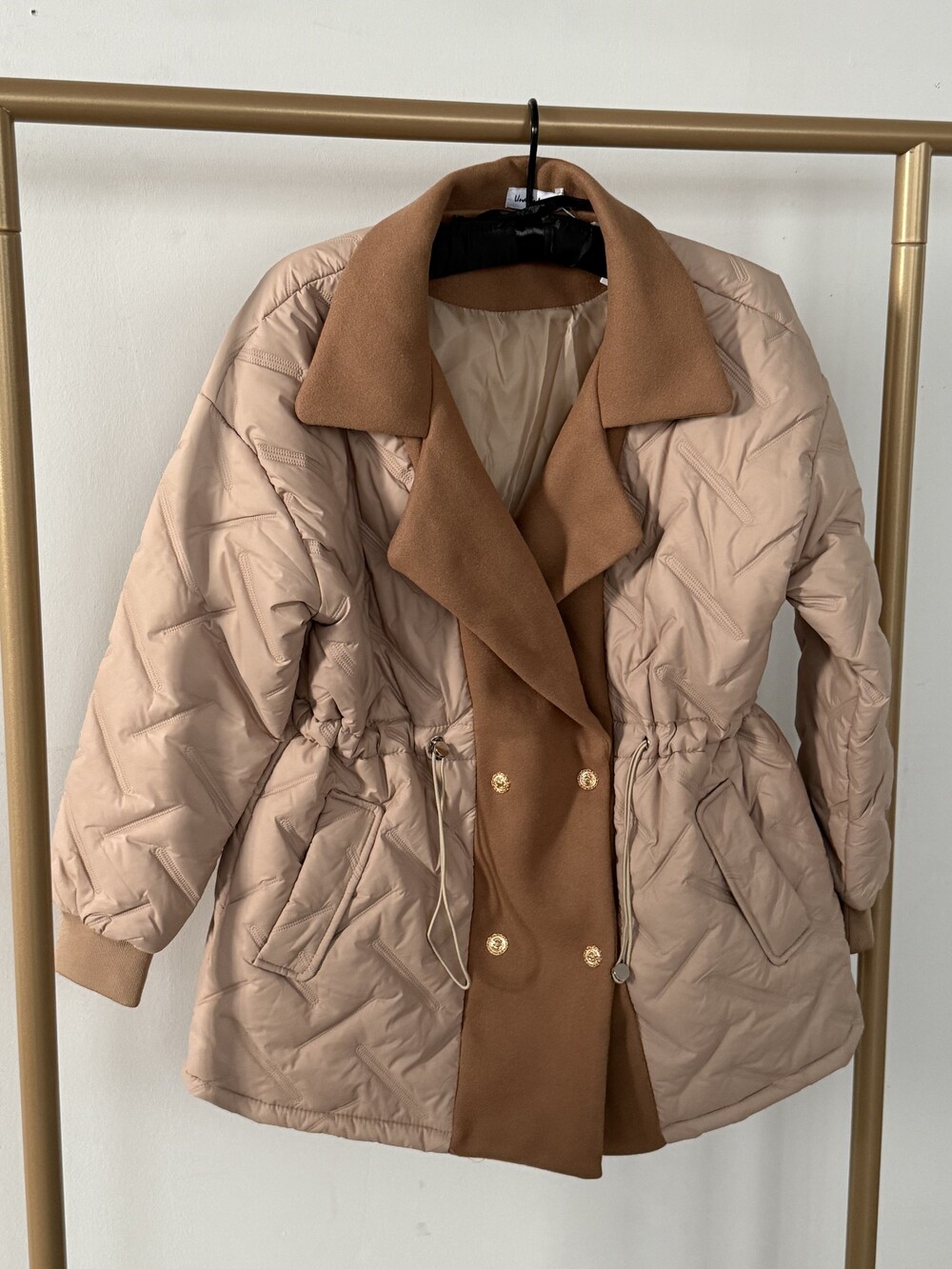 볼륨감 있는 퀼팅 소재와 와이드 라펠이 돋보이는 여성용 패딩 자켓입니다.
