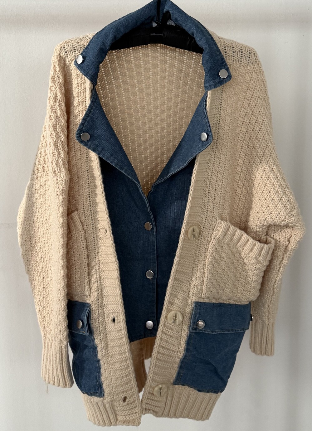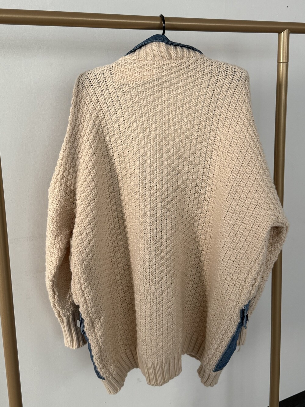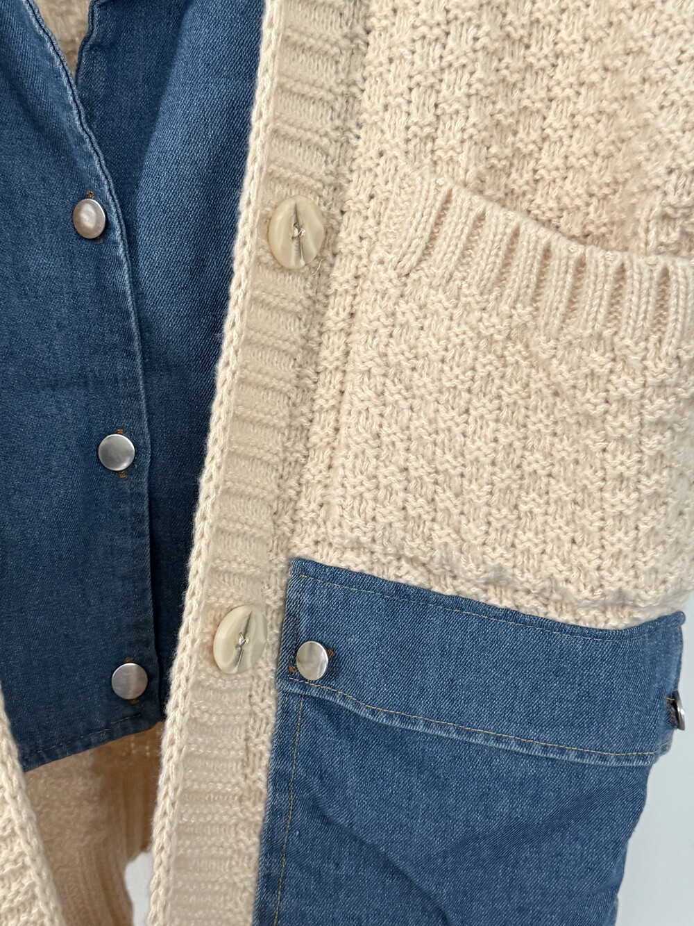 입체적인 짜임의 니트 위에 데님 포켓과 카라, 앞단을 배색으로 덧대어