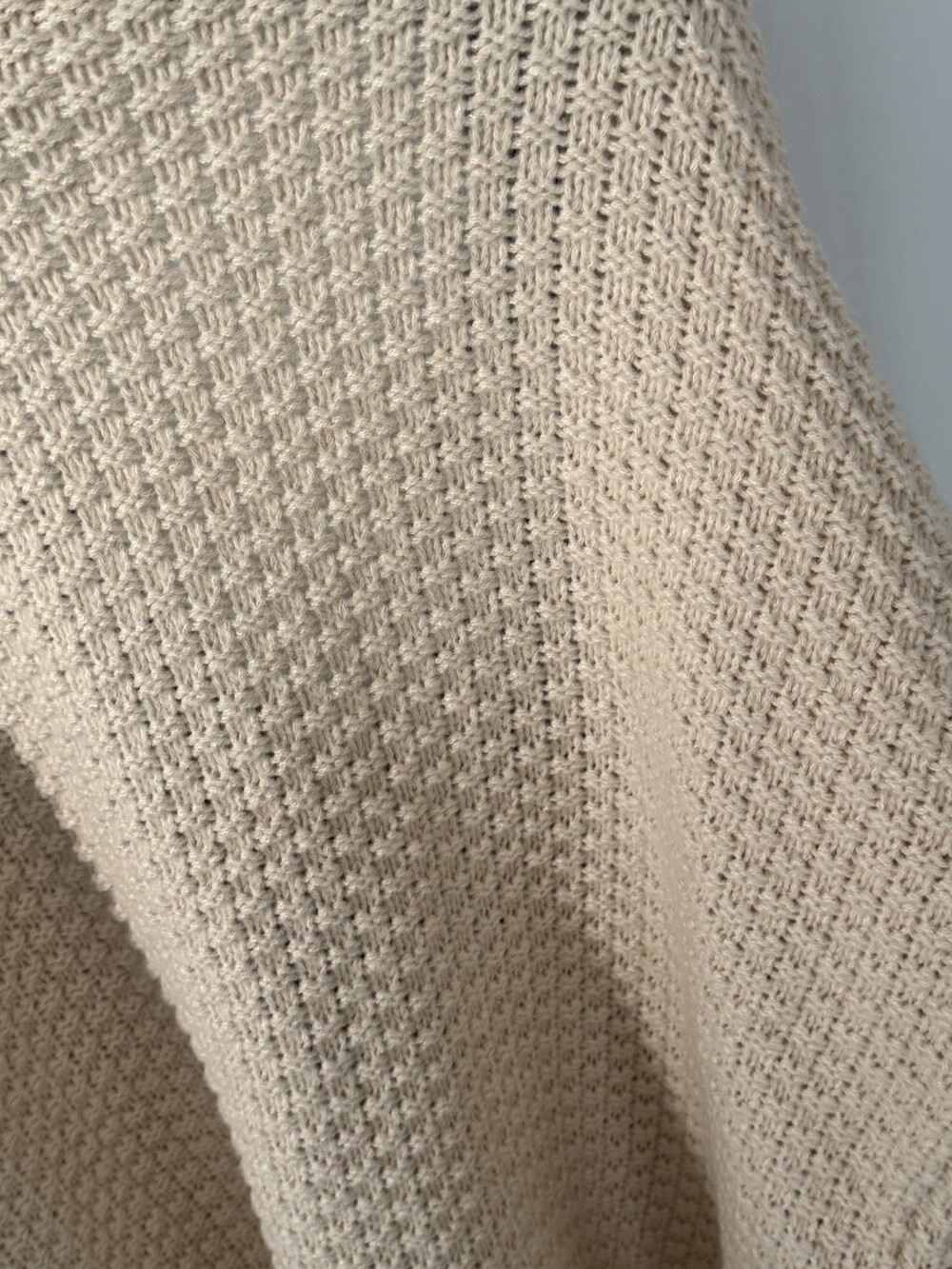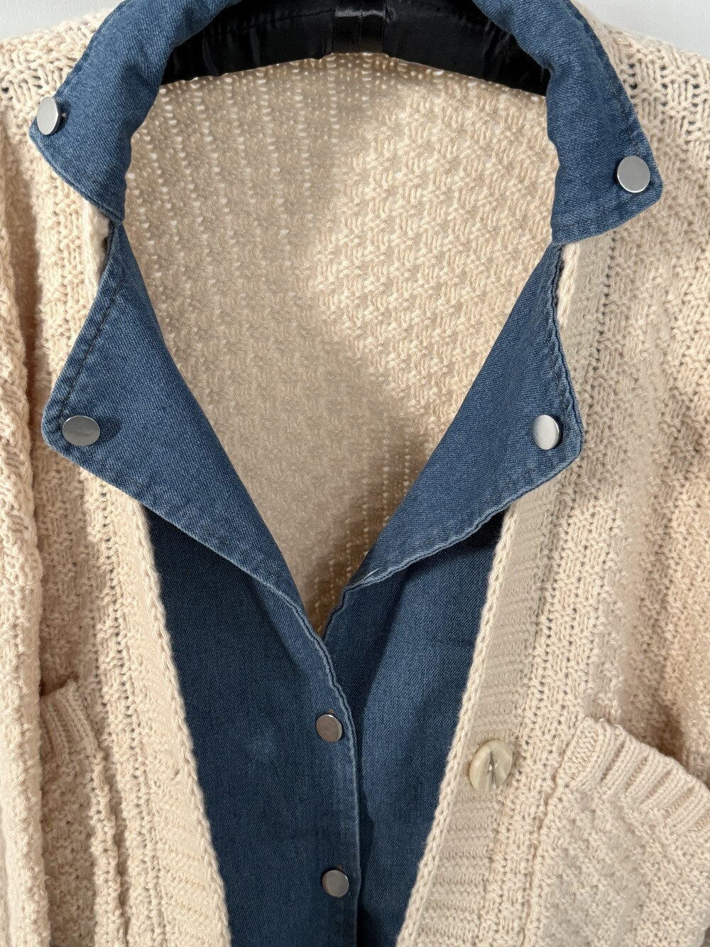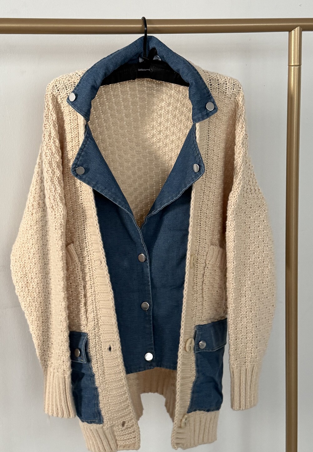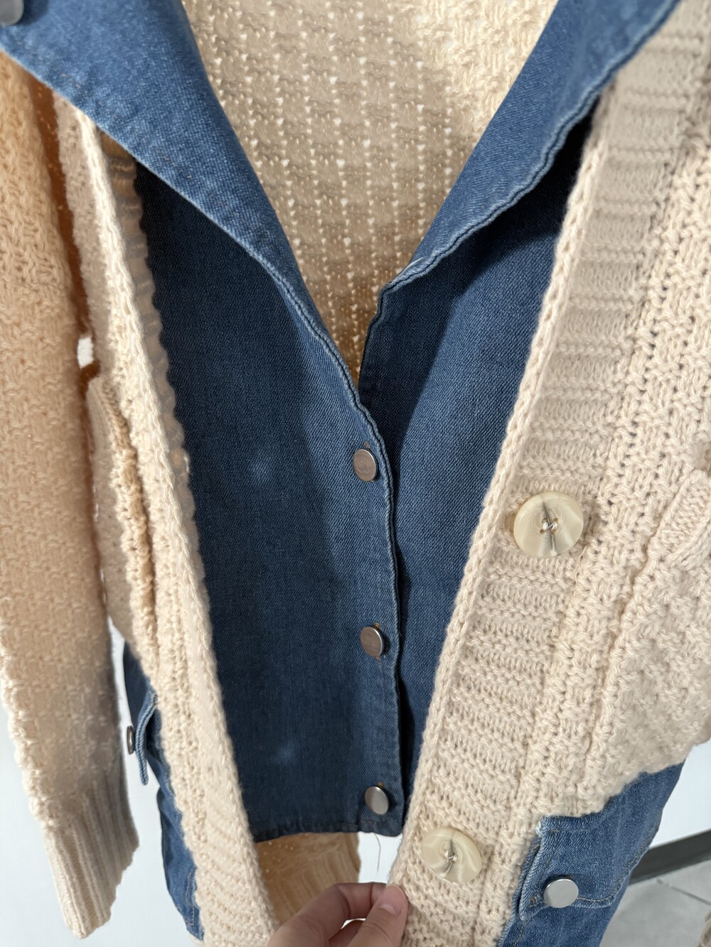 입체적인 짜임의 니트 위에 데님 포켓과 카라, 앞단을 배색으로 덧대어