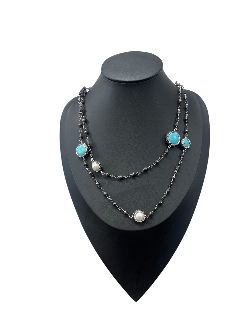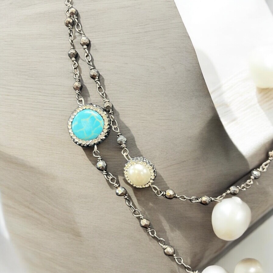 이 목걸이는 보헤미안, 빈티지 또는 절충주의적 보석을 좋아하는 여성에게 어필할 것입니다. 화려한 액세서리를 좋아하고 스타일을 표현하는 것을 두려워하지 않는 사람에게 이상적입니다. 캐주얼하거나 예술적인 라이프스타일을 즐기는 사람들은 이 목걸이를 특히 매력적으로 느낄 것입니다. 청록색 돌, 진주, 시드 구슬을 조합하여 시각적으로 풍부한 매력을 선사합니다. 목걸이의 길이는 목선을 강조하고 얼굴에 시선을 집중시키도록 디자인되었습니다.