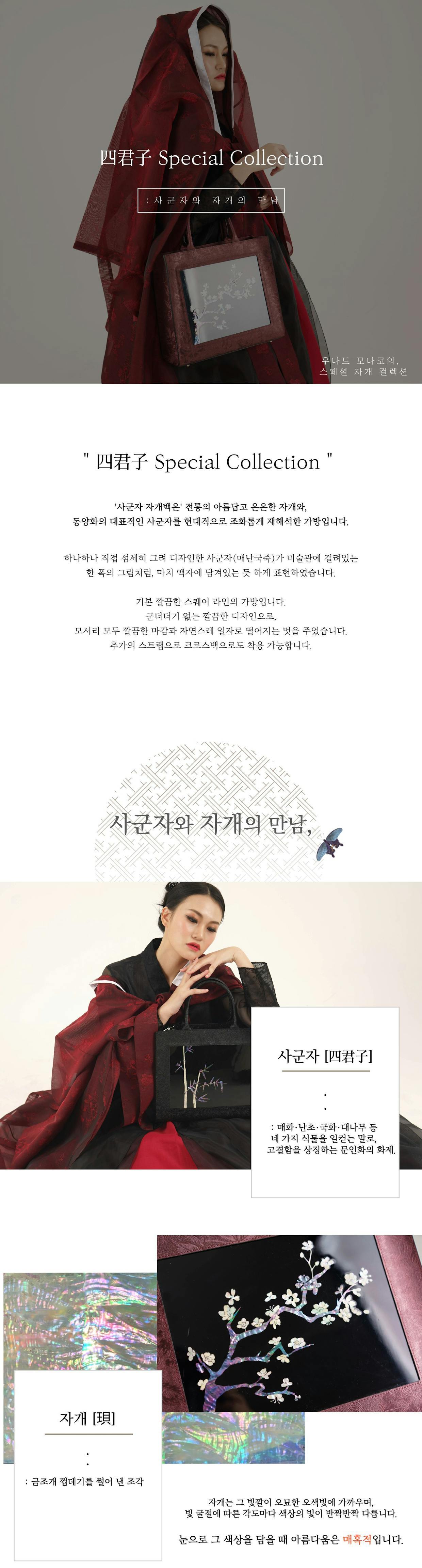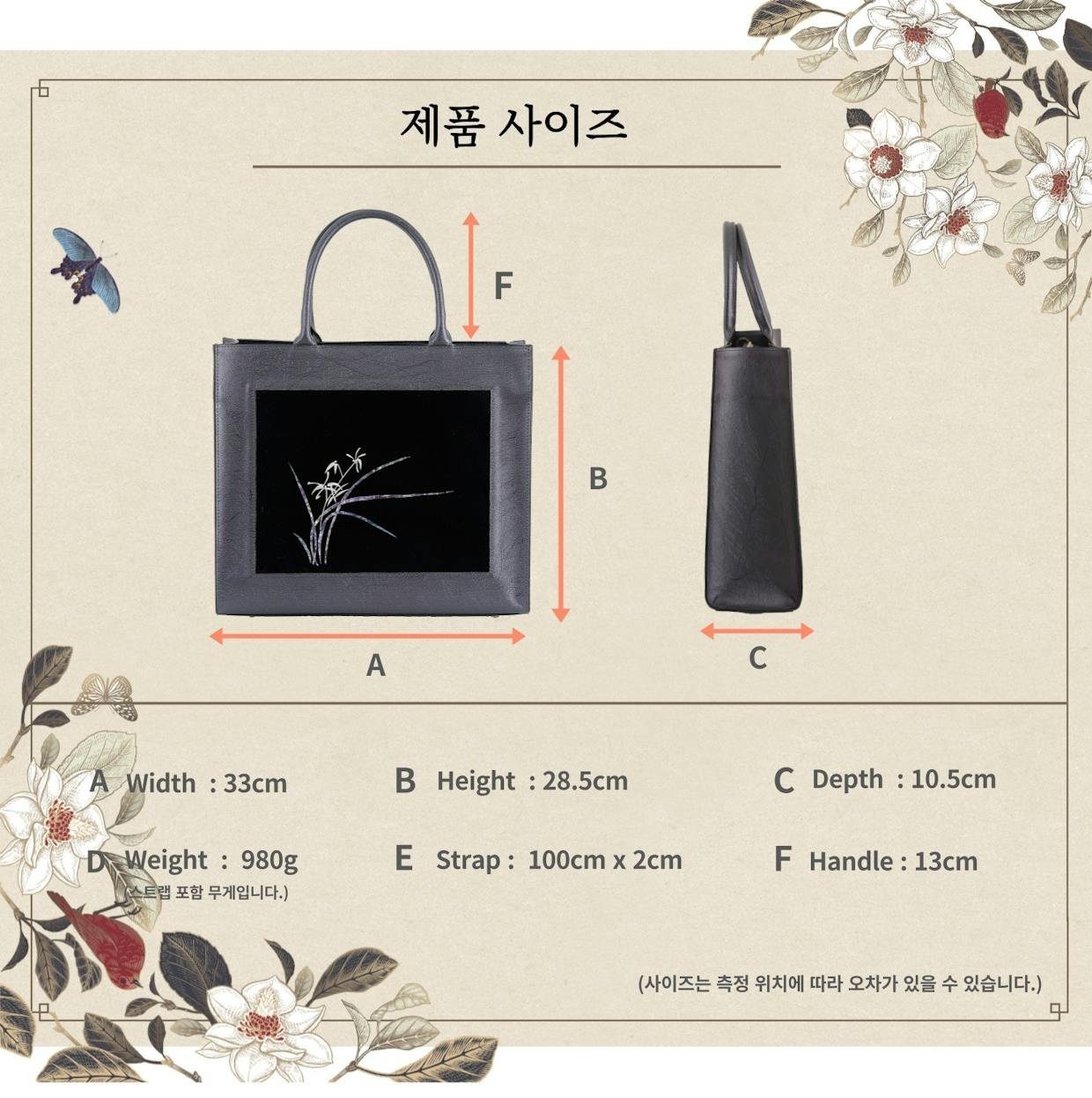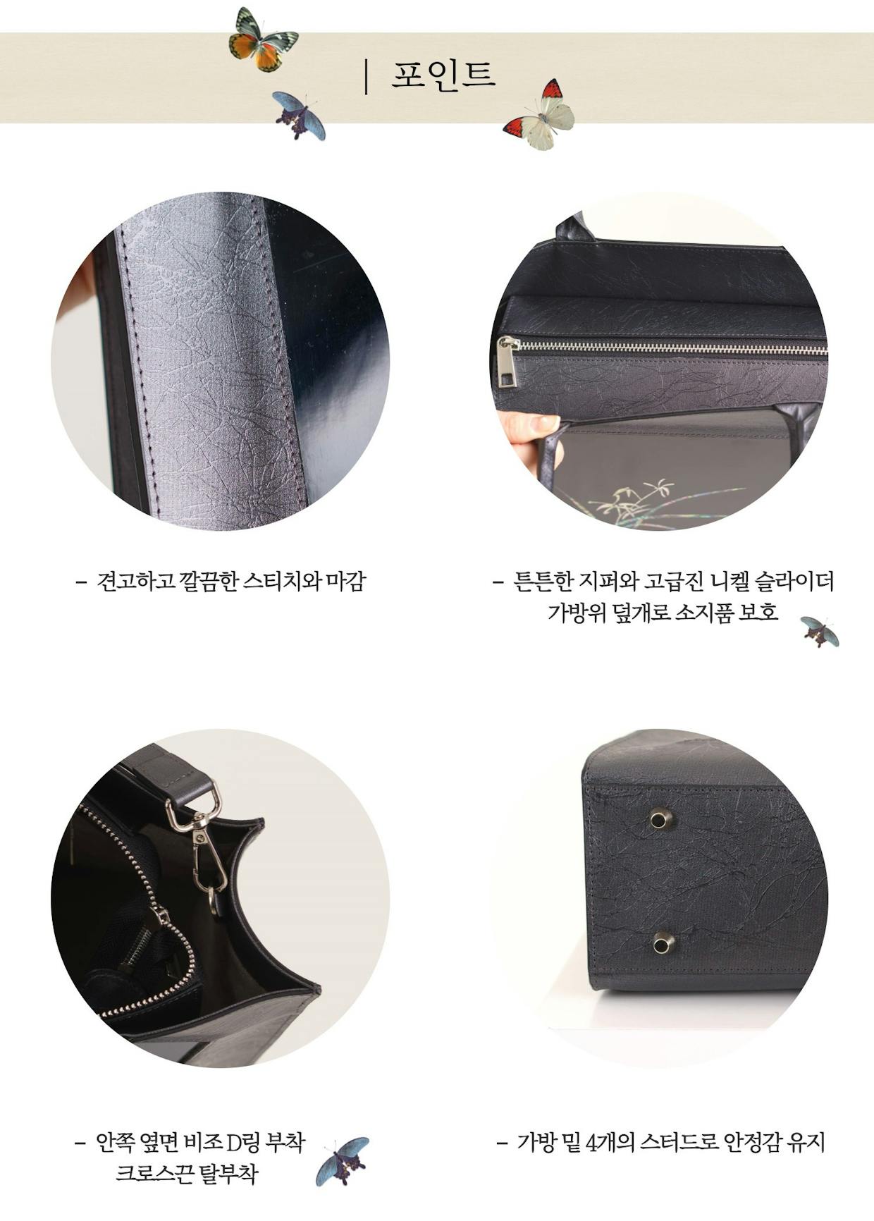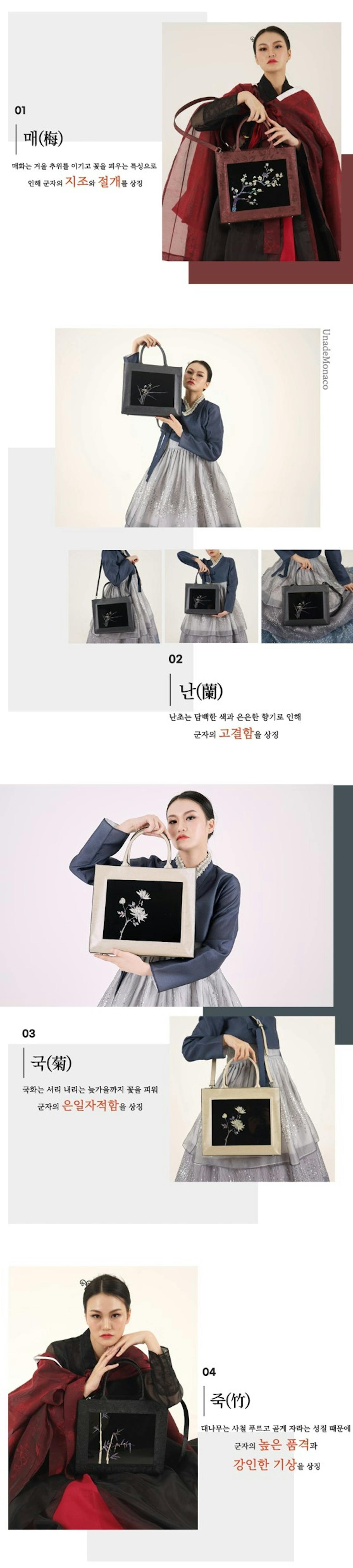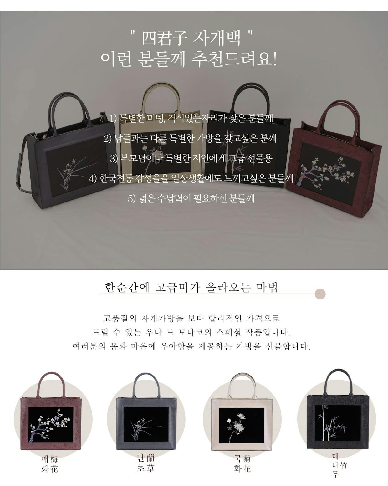 자개판은 알루미늄판을 사용하여 가방에 부착하였을때 보다 더 단단하고 안정적으로 가방과 결합할 수 있게 하였습니다. 또한 42년 장인의 손길로 한땀한땀 정성스레 자개를 부착하였습니다.사군자 각각의 아름다움을 표현하기위해 많은 노력을 기울였습니다.