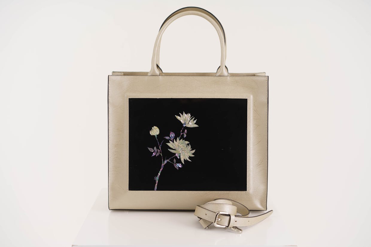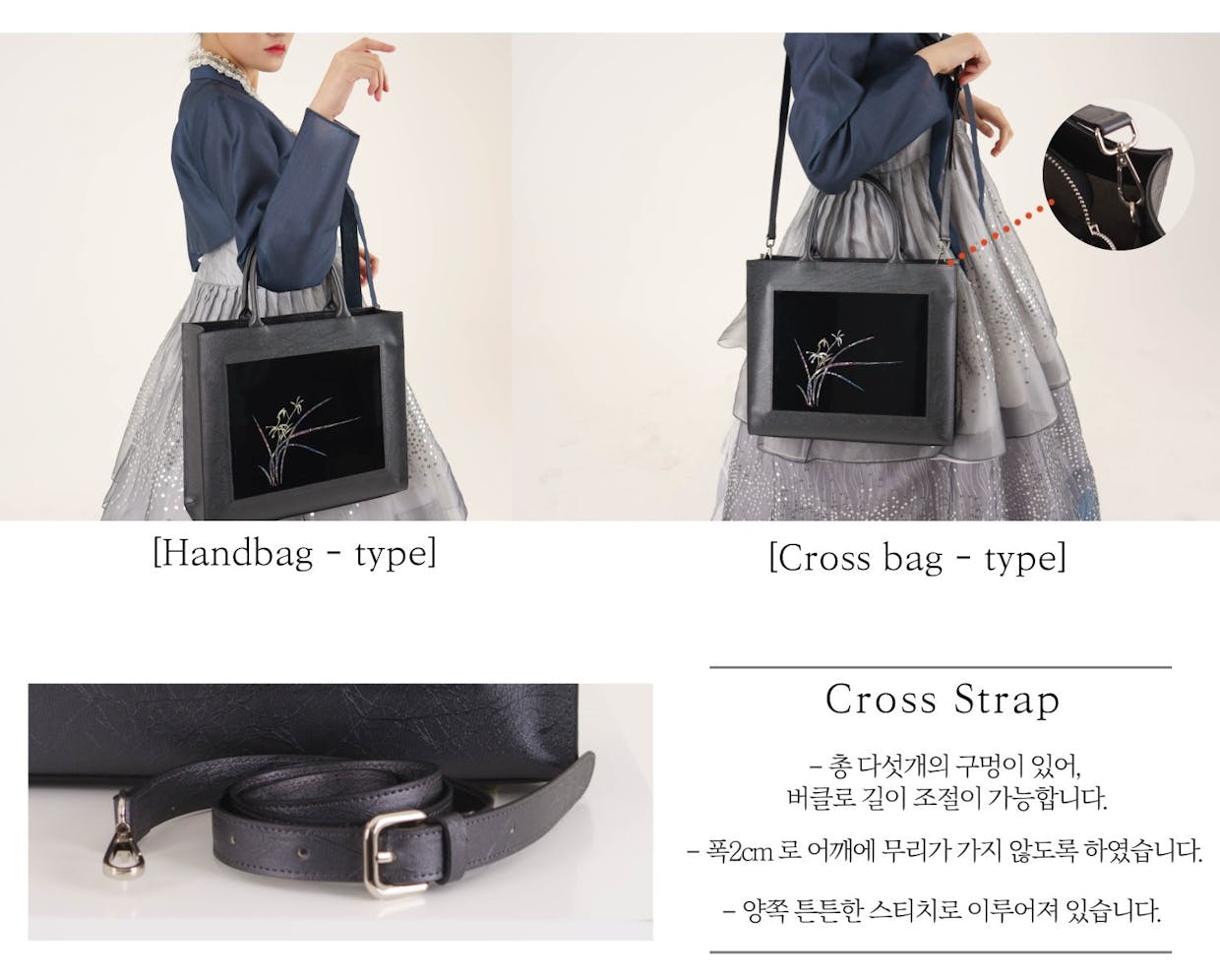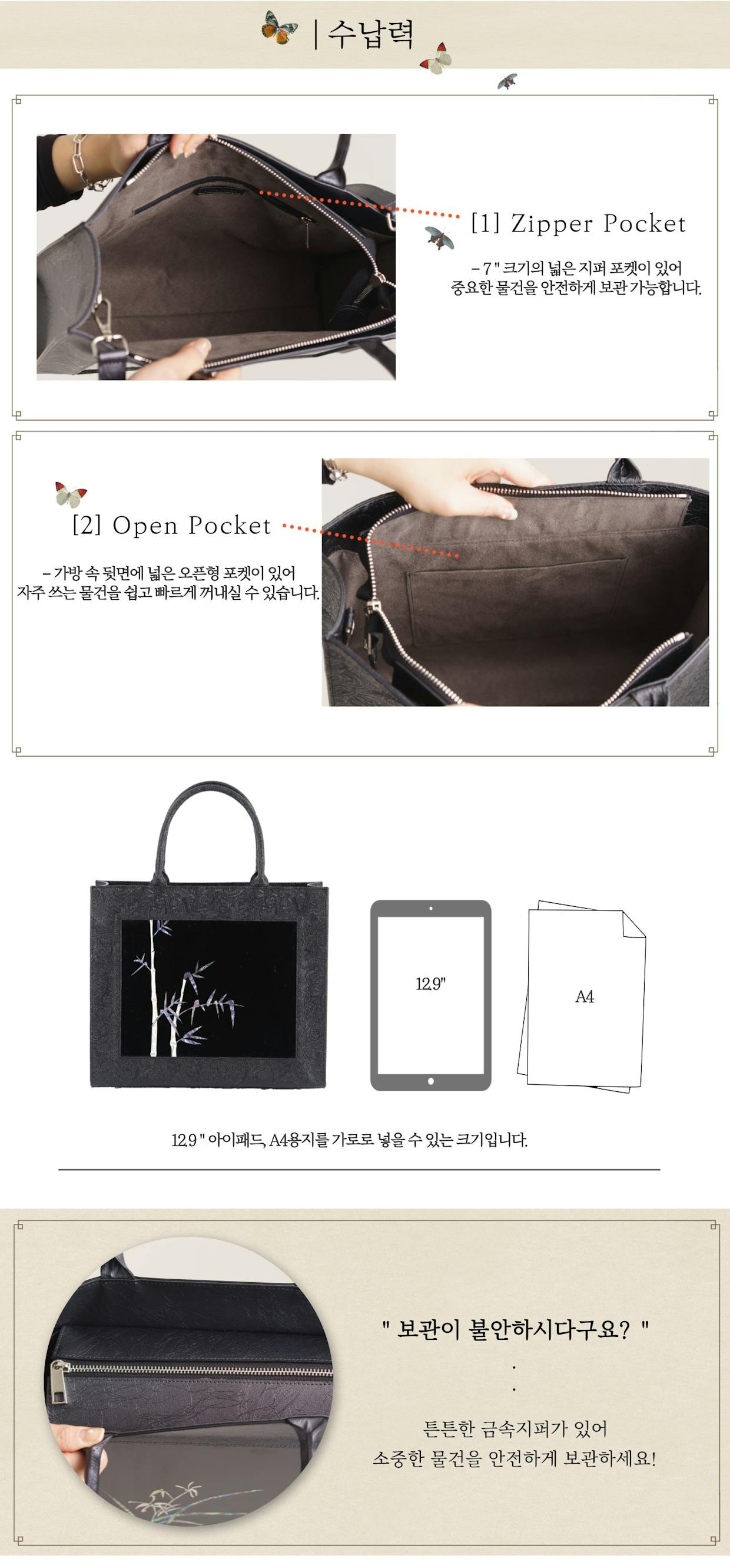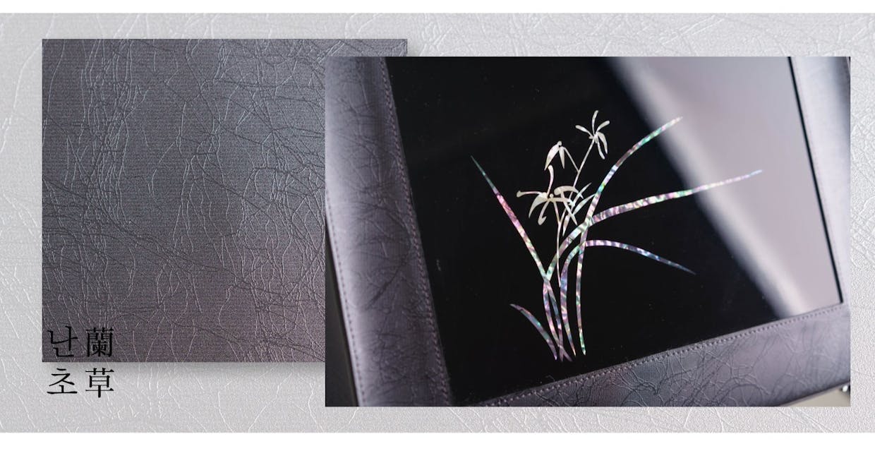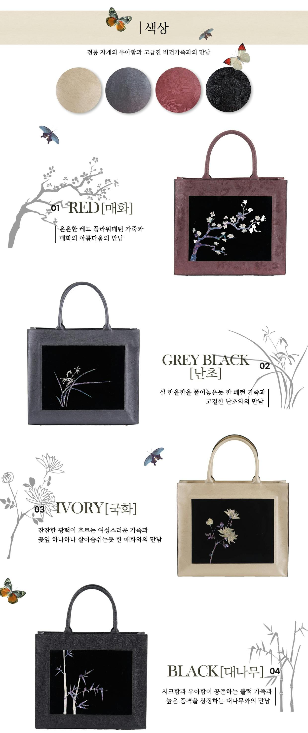 자개판은 알루미늄판을 사용하여 가방에 부착하였을때 보다 더 단단하고 안정적으로 가방과 결합할 수 있게 하였습니다. 또한 42년 장인의 손길로 한땀한땀 정성스레 자개를 부착하였습니다.사군자 각각의 아름다움을 표현하기위해 많은 노력을 기울였습니다.