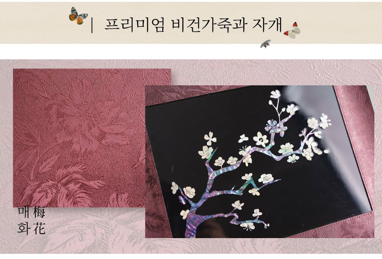 매화는 겨울 추위를 이기고 꽃을 피우는 특성으로 지조와 절개를 상징합니다.그 뜻에 걸맞는 고급진 꽃이 들어간 은은한 광이 나는 잔잔한 레드컬러로 제작하였습니다.