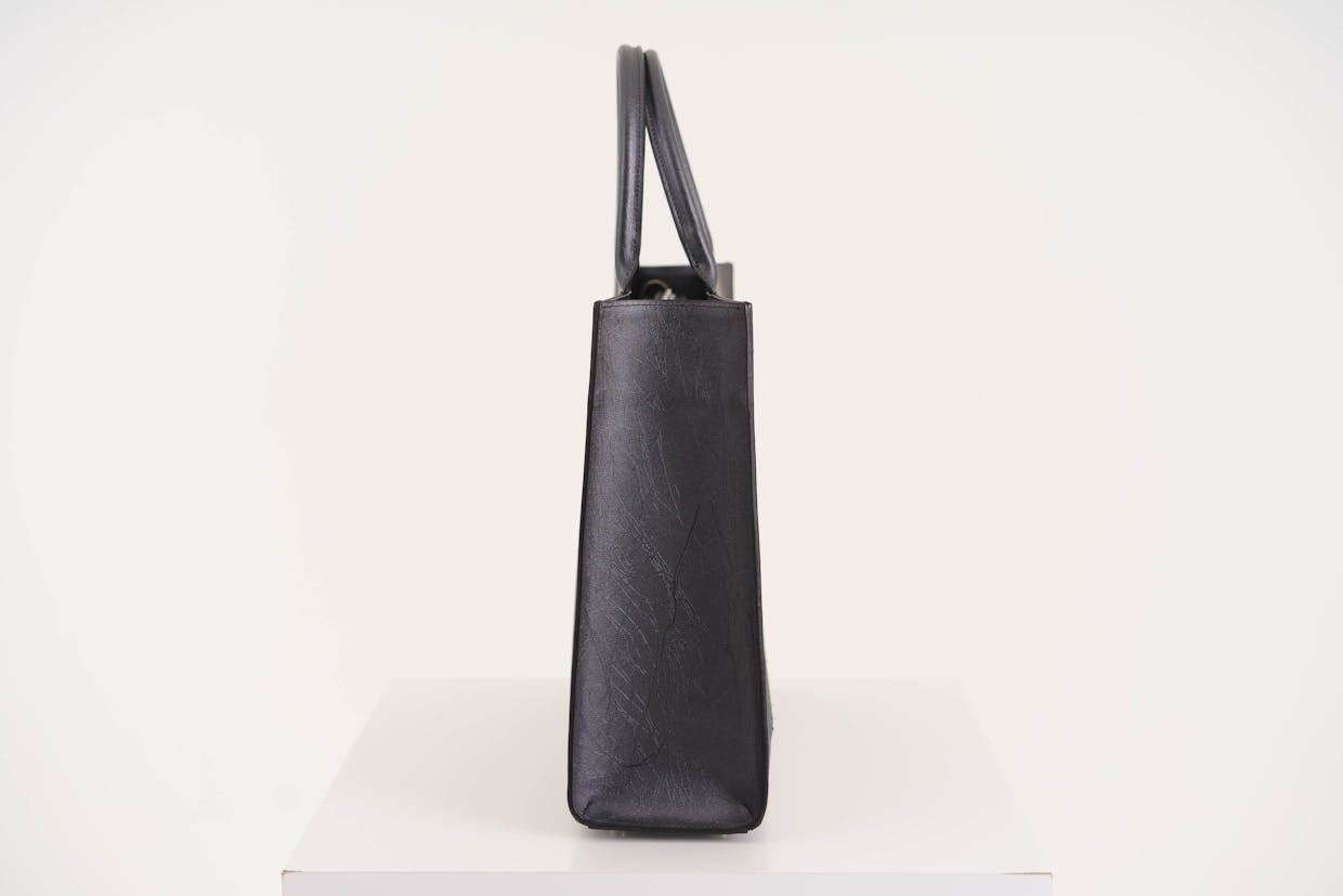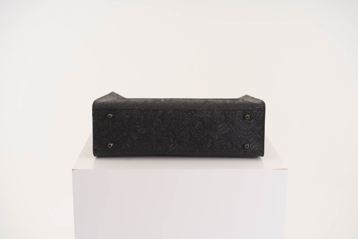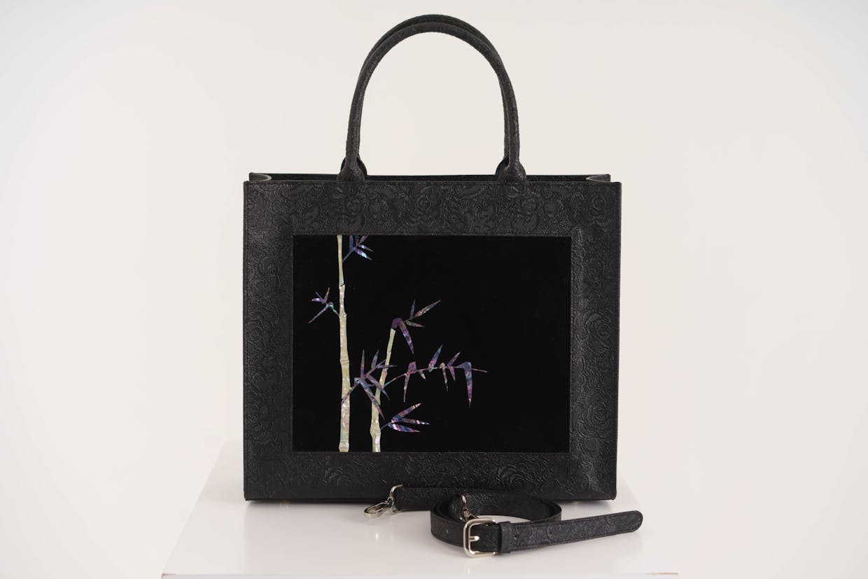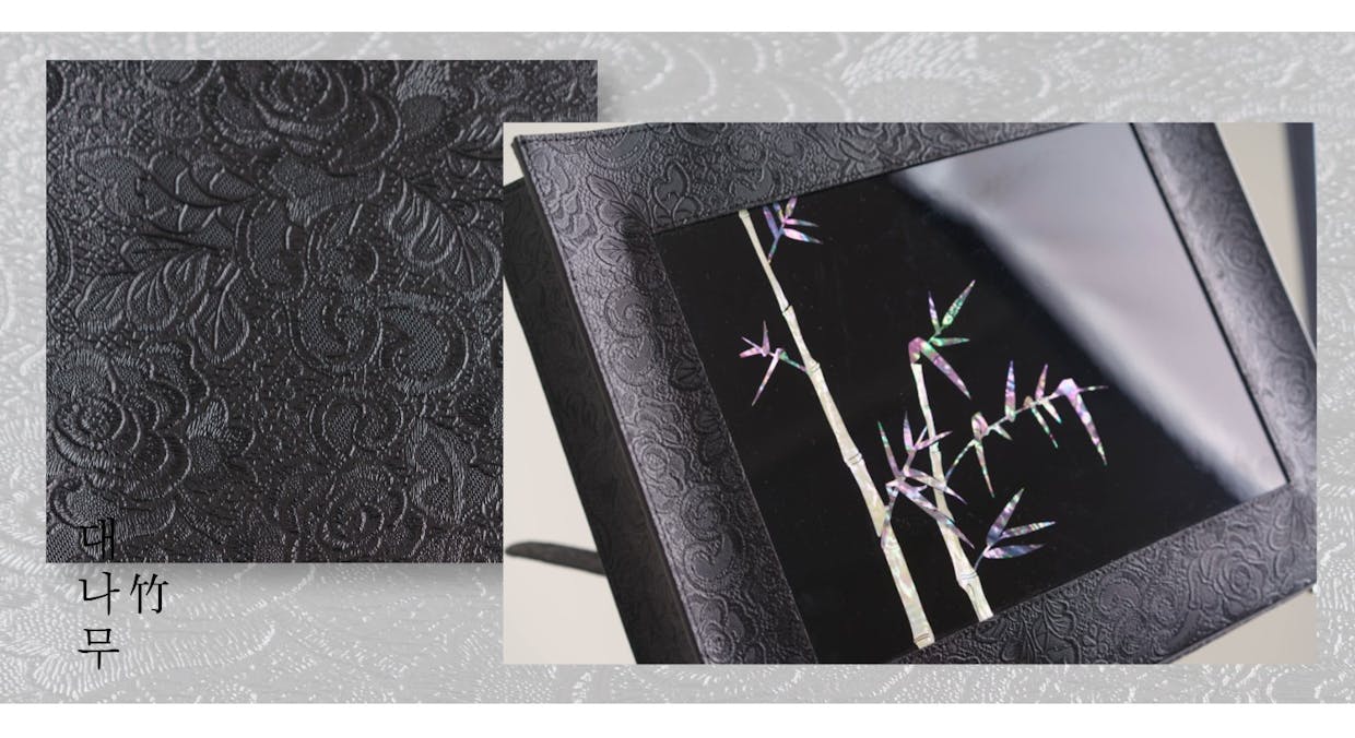 대나무는 사철 푸르고 곧게 자라는 성질 때문에 높은 품격과 강인한 기상을 상징합니다.그런 대나무를 더욱 더 돋보일 수 있게 강렬하고도 차분한 블랙컬러 비건원단으로 제작하였습니다.가죽에 꽃과 나뭇잎이 아름답게 짜여져 있습니다.