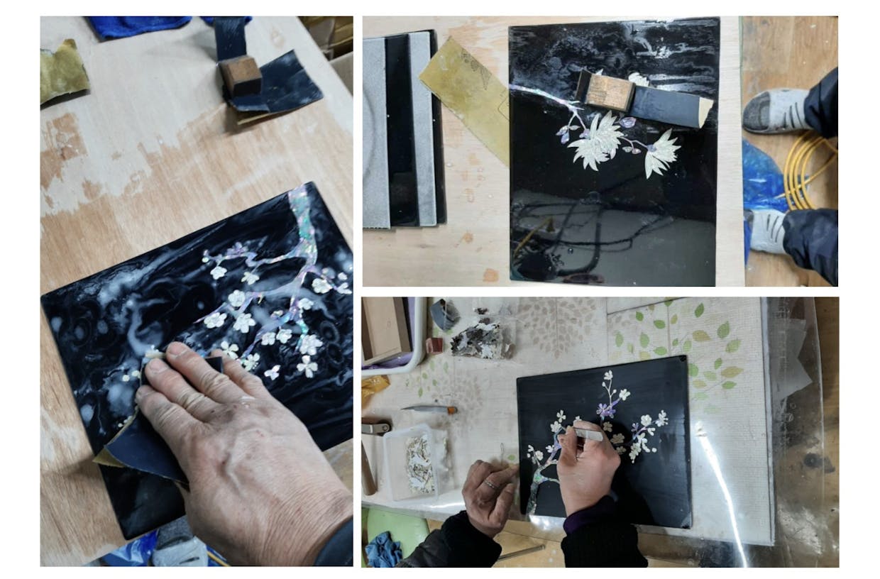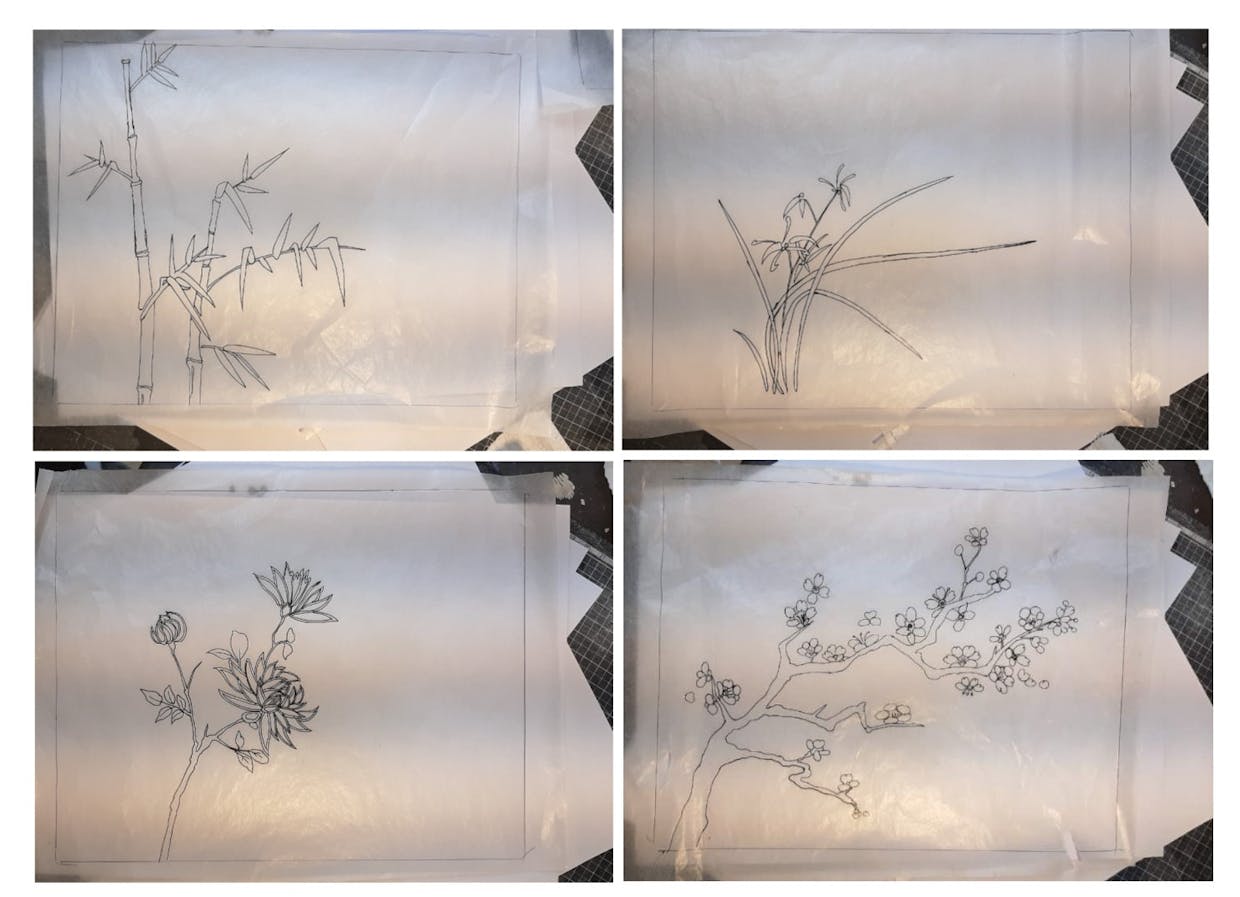 직접 디자인한 사군자를 자개로 표현하기 위해 그림을 본뜨는 과정입니다.