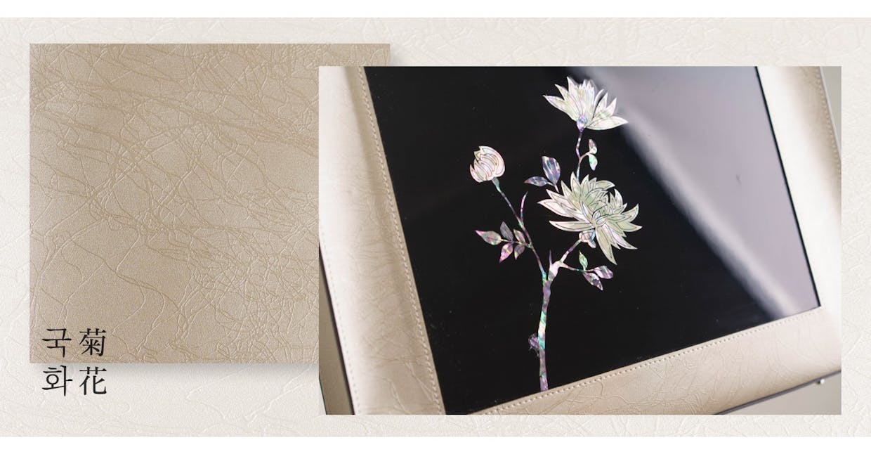 국화는 서리 내리는 늦가을까지 꽃을 피워 은일자적함을 상징합니다.국화의 아이보리 꽃잎색과 어울리는,잔잔한 광이 맴돌아 한번 보면 그 우아함에 빠지게 되는 비건가죽으로 제작하였습니다.