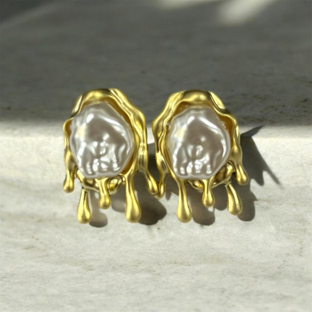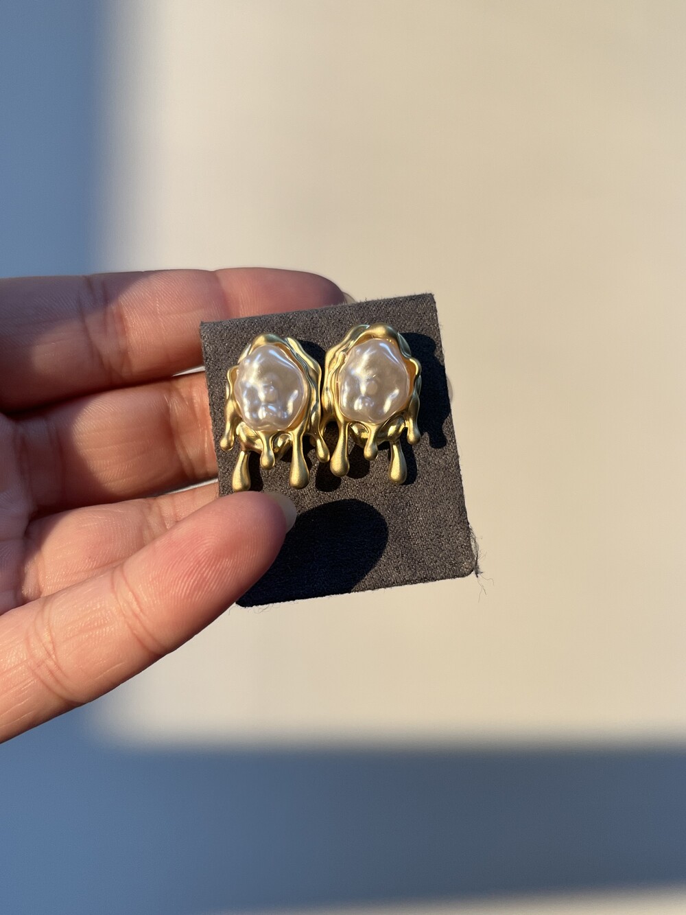 이 귀걸이는 고전적인 진주를 아방가르드 디자인으로 재해석하여 세련되고 과감한 룩을 연출합니다. 진주 주변에서 녹아내리는 듯한 금색 금속은 진주에 유기적이고 현대적인 느낌을 줍니다. 독창적이고 과감한 창작물을 좋아하는 사람들에게 완벽한 보석입니다.