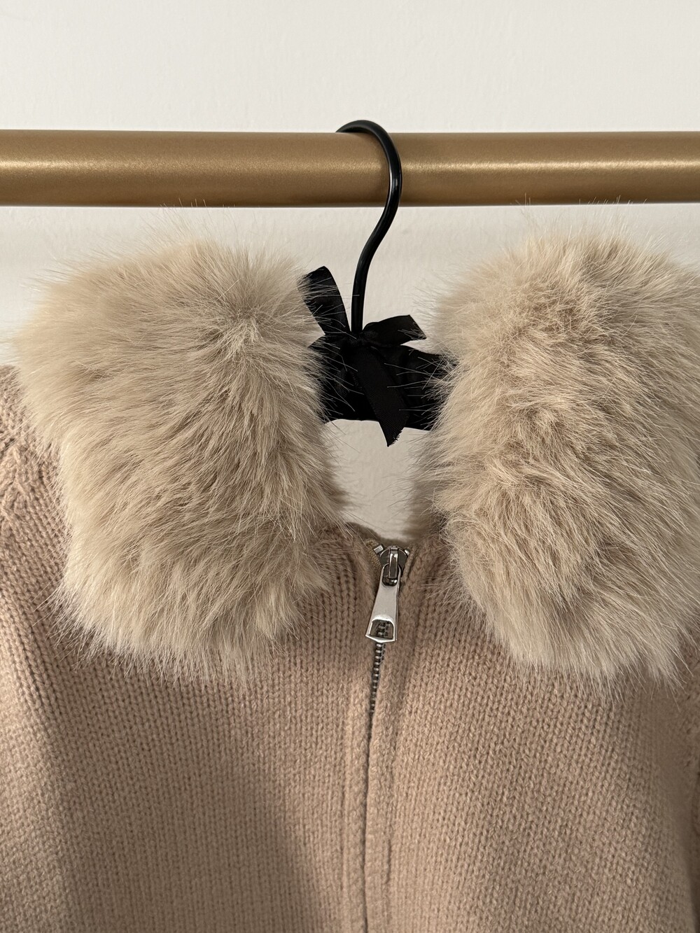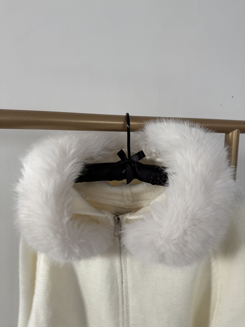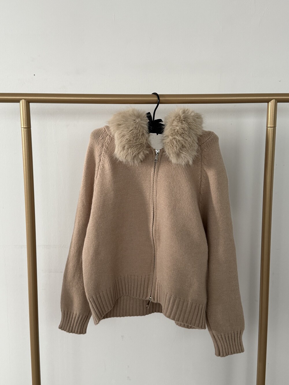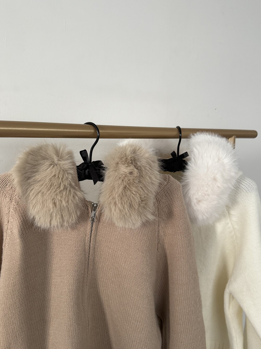 고급스러운 질감의 니트 소재 위로 풍성한 퍼카라가 더해져 따뜻하면서도 여성스러운 분위기를 완성합니다.