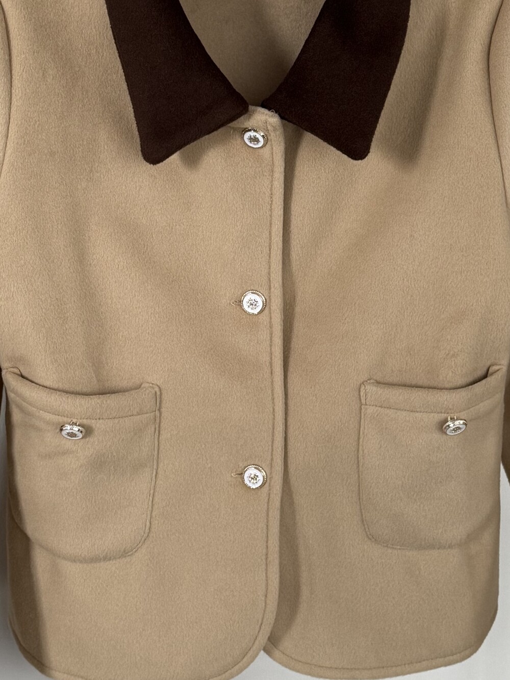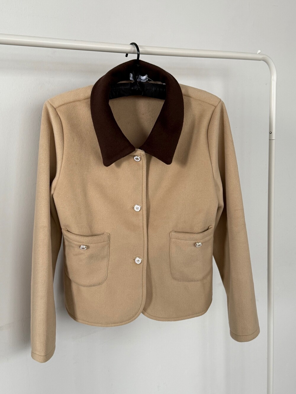 클래식한 감성과 세련된 배색 포인트가 돋보이는 샤르망 카멜브라운 배색 자켓입니다.