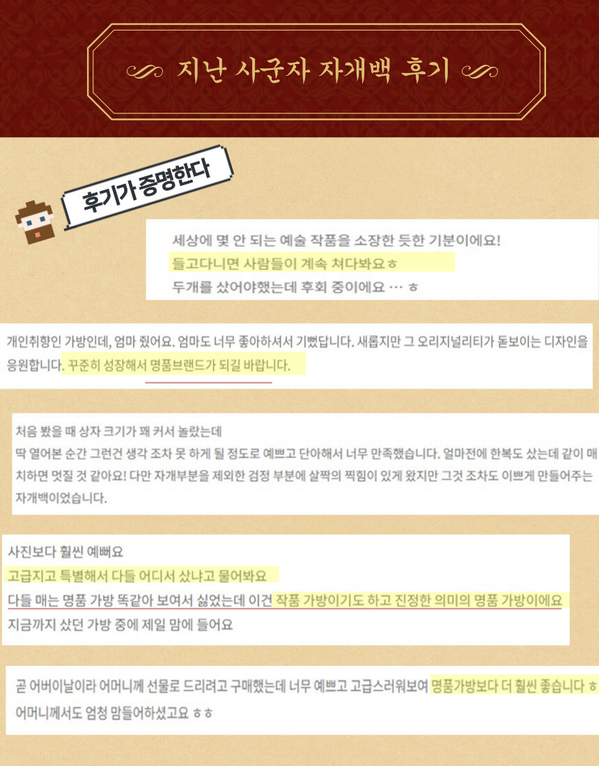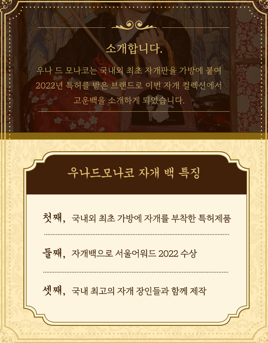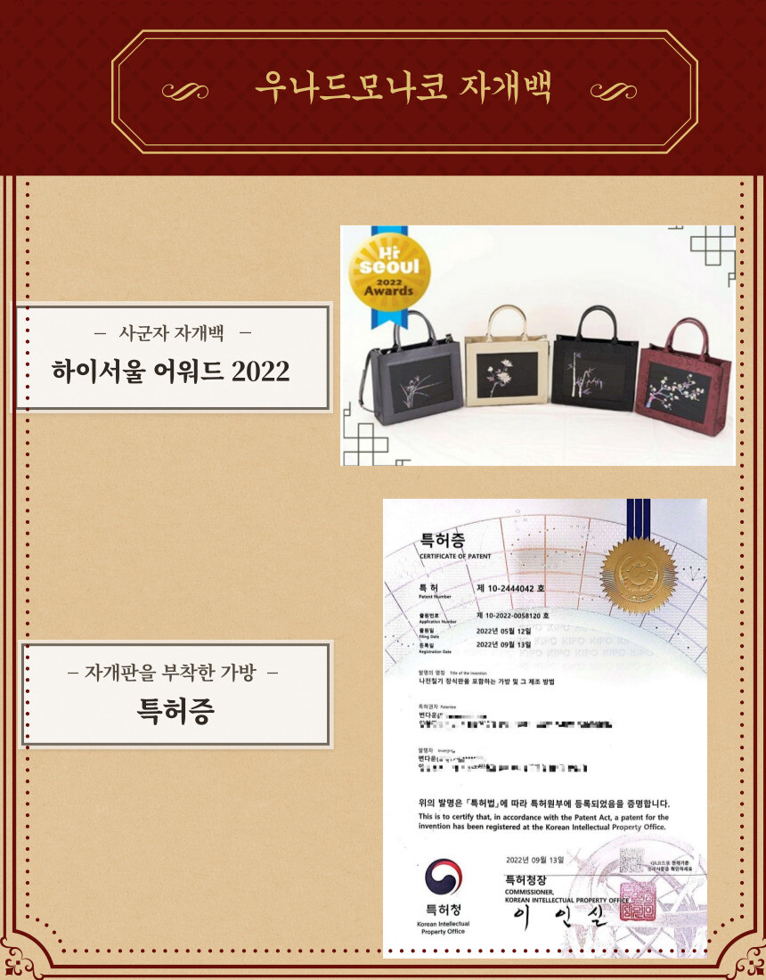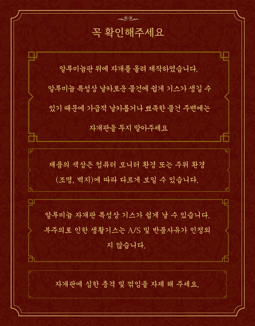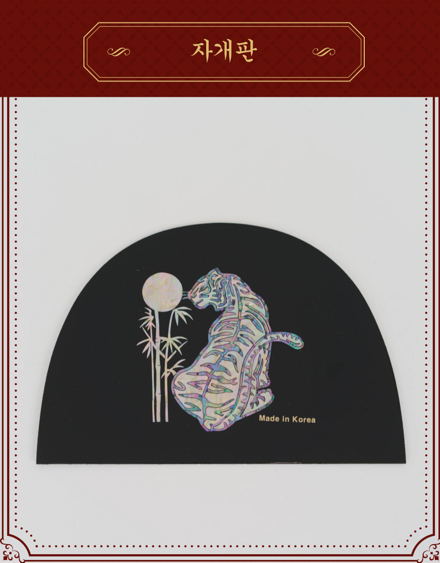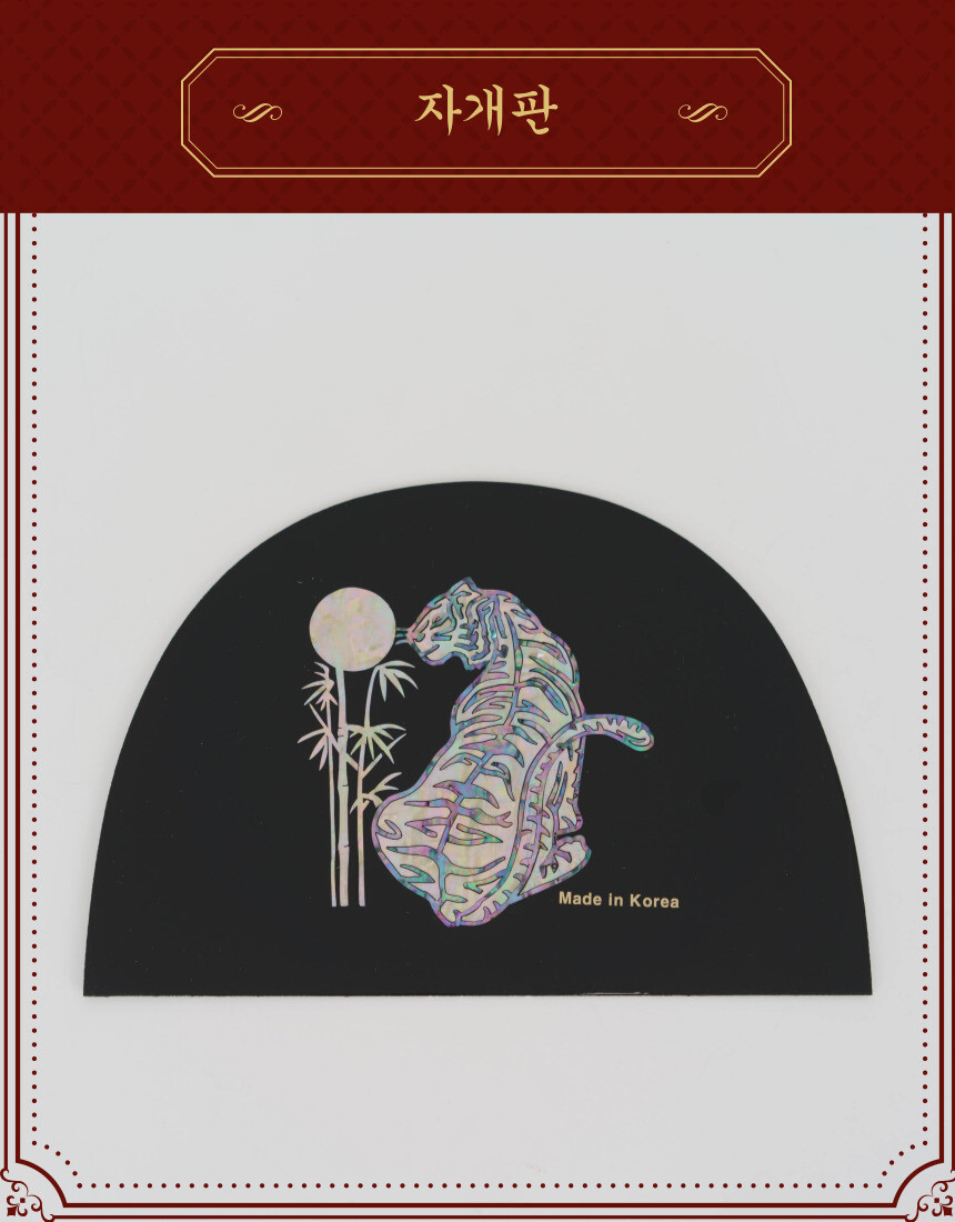 고객님들 피드백 자개판에 Made in Korea 는 샘플에만 적혀있고,금속이 자개판에서 반듯하게 붙히기 어려운 단점이 있어 실물 제작에는 제외했습니다.